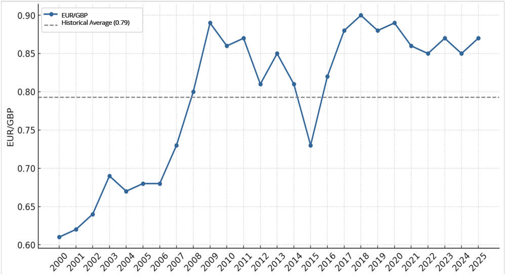 La evolución del dólar estadounidense (USD) y la libra esterlina (GBP) frente al euro (EUR) en los últimos 25 años muestra una elevada volatilidad estructural situando el tipo medio de cambio en torno al 1,19 y del 0,79 respectivamente. Esto refuerza la importancia de una política de cobertura flexible, que combine disciplina y capacidad de adaptación.