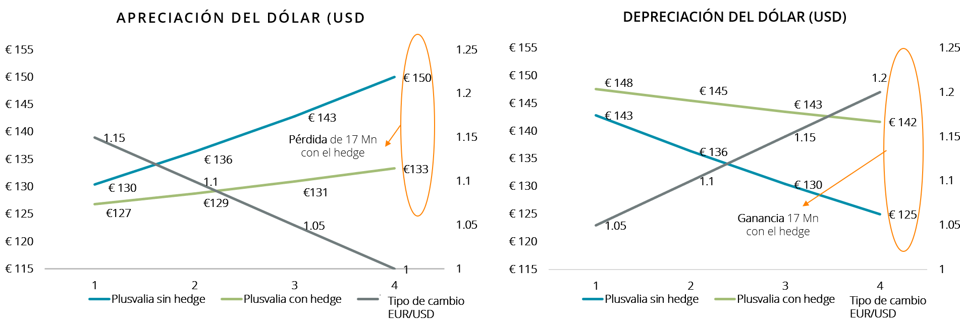 A modo de ejemplo mostramos a continuación dos ejemplos donde se puede ver el efecto de las coberturas en dos escenarios tomando como ejemplo la apreciación y depreciación del dólar sobre el euro en base 100: