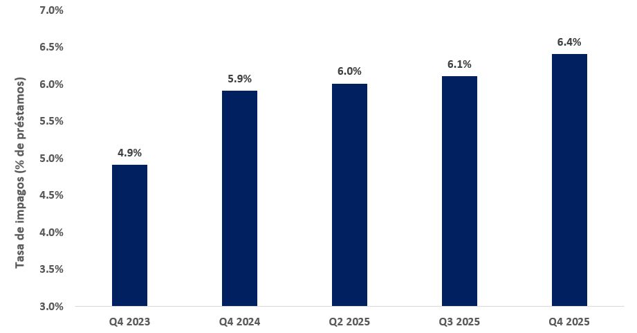 Además, las tasas de impago son coherentes con una fase madura del ciclo, pero se mantienen muy por debajo de escenarios de crisis sistémica como los de 2008–2009 o incluso del shock de 2020.