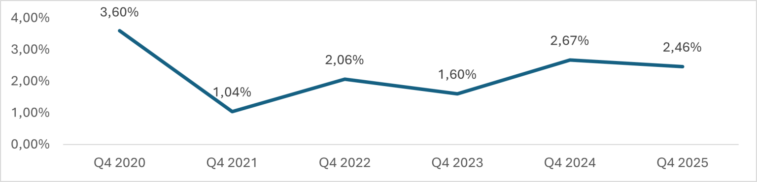 - Incremento de métricas tempranas de estrés: Non-accruals, uso creciente de PIKs y dinámicas amend-and-extend pueden anticipar tensiones en determinadas carteras. La «tasa de impago en la sombra» en el índice de Lincoln implica que la mala tasa de PIK aumentó de alrededor del 4,9% en 4T 2023 a 5,9% en 4T 2024, luego a alrededor del 6,4% en 4T 2025.